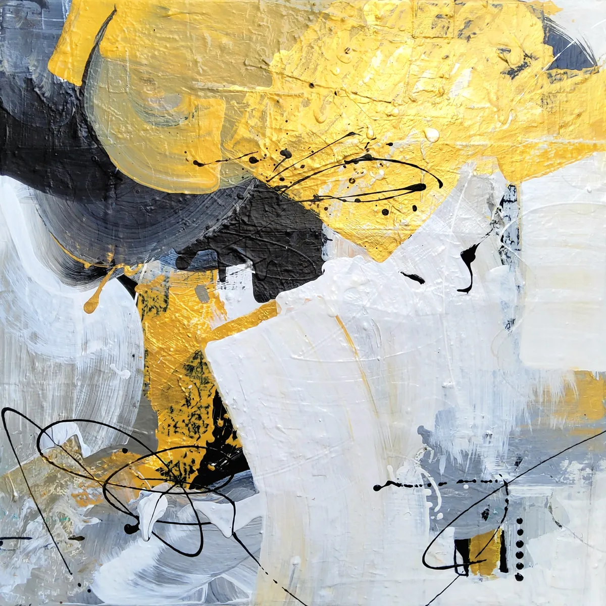 Professionelle malemedier på kvalitetslærred. Et maleri med kraftig struktur lavet med collagepapir og med teknikken vådt-i-vådt. Detaljer i guld reflekterer lyset og tilfører varme til maleriet. Kanten er malet sort og kan enten gemmes i en ramme eller fungere som en ramme i sig selv. Signatur i guld