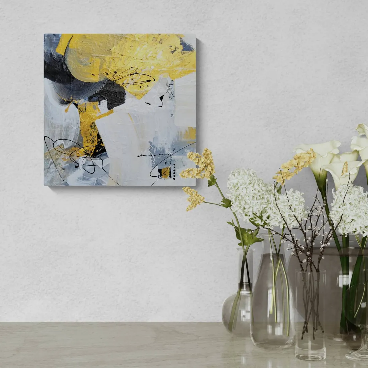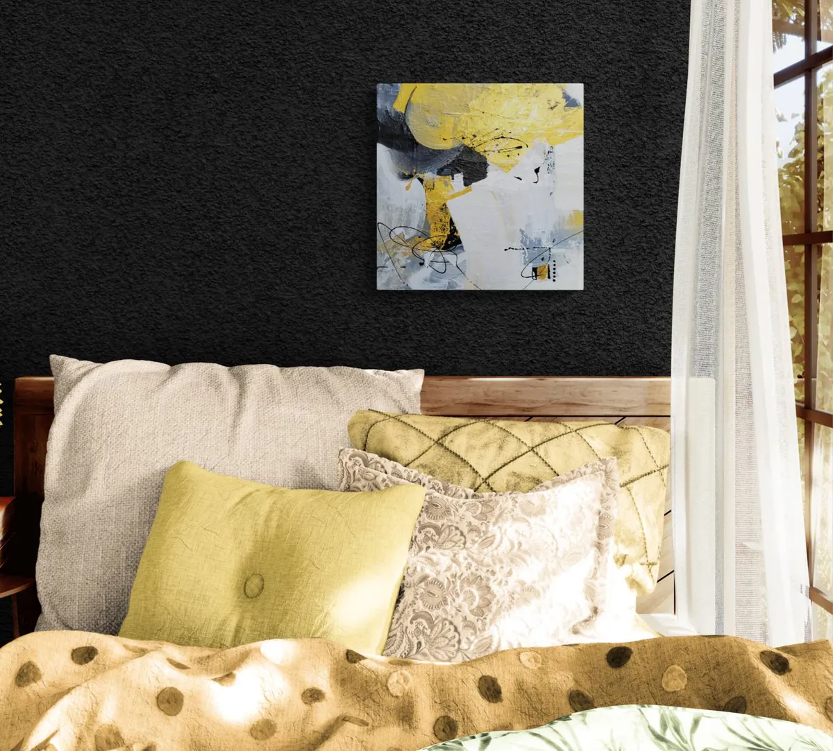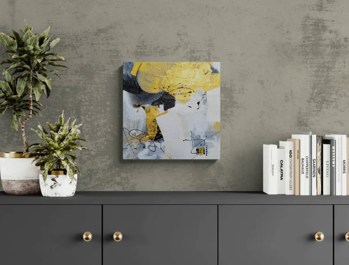 Professionelle malemedier på kvalitetslærred. Et maleri med struktur lavet med collagepapir og med teknikken vådt-i-vådt. Detaljer i guld reflekterer lyset og tilfører varme til maleriet. Kanten er malet sort og kan enten gemmes i en ramme eller fungere som en ramme i sig selv. Signatur i guld
